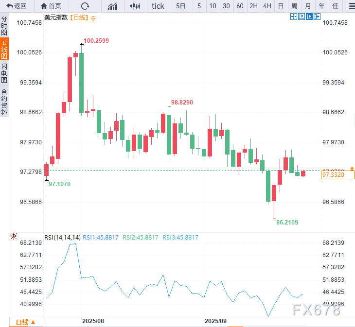 (美元指数日线图,来源:易汇通)北京时间11:10,美元指数现报97.33。