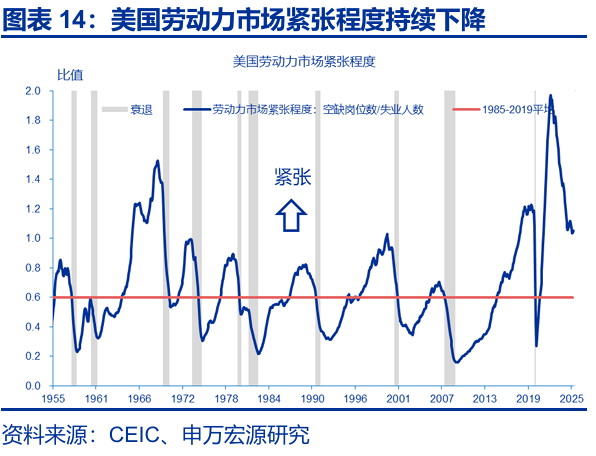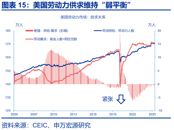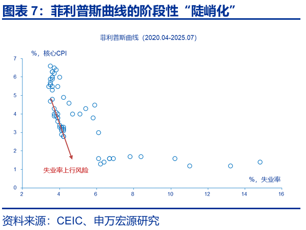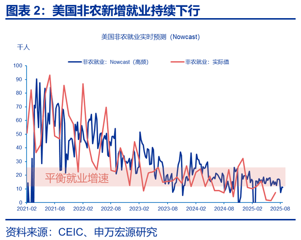 劳动力市场状况方面,鲍威尔的描述为:供需双弱下“脆弱的平衡”,且就业下行风险趋于上行。7月就业报告改变了鲍威尔的政策立场。5-7月,美国平均非农就业增速下降至3.5万,显著低于2024年的月均增速(16.8万),也低于所谓的“平衡就业增速”(breakeven employment growth)。这预示着,短期内,失业率易上难下、货币政策“易松难紧”。