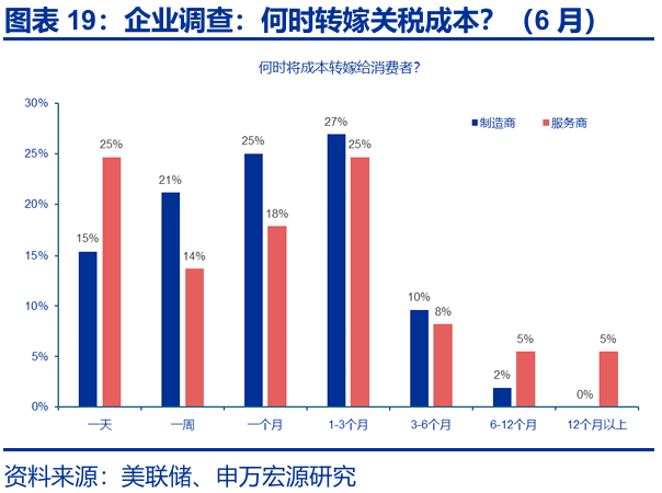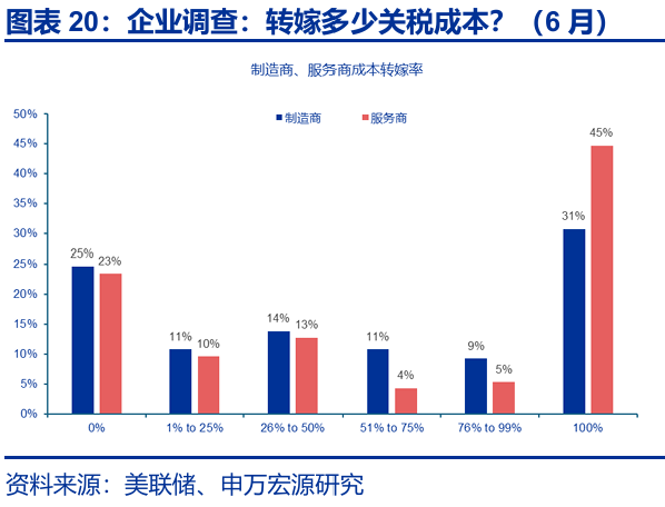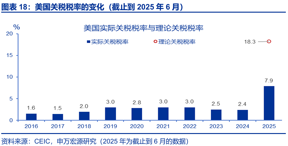 一方面,与2018年关税1.0不同,关税2.0的通胀效应或更加“平滑”,通胀的高点或有所“后置”:(1)2025年,美国关税税率的上行幅度远超2018年。截止到6月,美国动态有效关税税率已经升至7.9%左右,较2024年累计上行约5.5个百分点,而2018年和2019年仅上行0.5和1个百分点。按照2024年商品权重和当前关税税率(截止到8月23日)计算,美国进口商品的加权平均税率约为18.3%。所以,关税税率仍在上行过程中;(2)2022年以来,美国通胀持续上行,叠加年初以来的消费放缓,企业转嫁成本的能力有所下降,但用盈利消化关税成本或只是“暂时的”。未来一段时间内,(不同比例地)转嫁成本仍是绝大多数企业的选择。