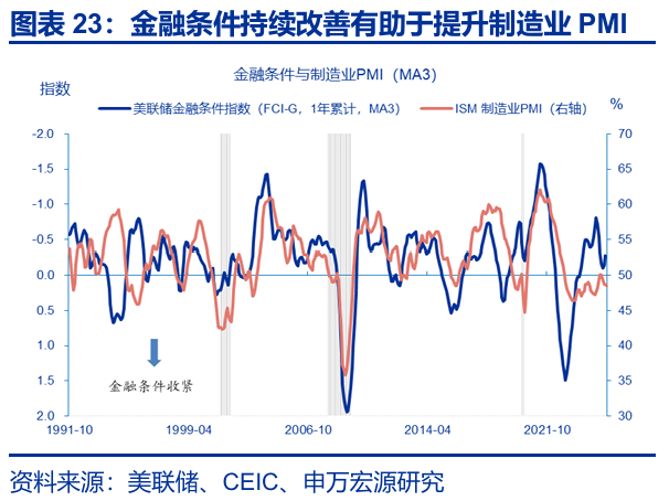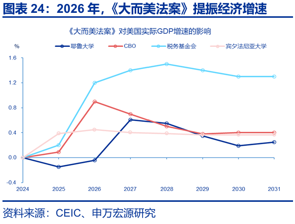 另一方面,在降息落地、金融条件持续宽松、财政脉冲和私人部门需求回补共振的背景下,我们对2026年的美国经济持乐观看法。关税对增长的负冲击也是“一次性”的。2026年,在关税不确定性下降和对等关税+232关税壁垒的“保护”下,叠加降息落地、金融条件改善、《大而美法案》中新增减税条款的生效,美国企业资本开支意愿有望企稳反弹,制造业PMI有望转向高景气区间。