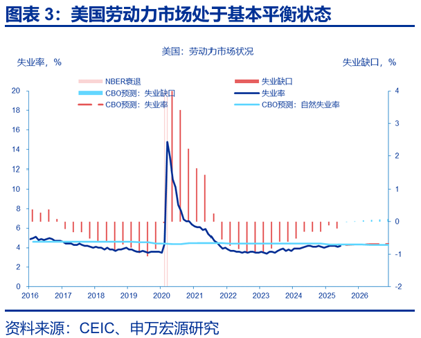 美联储降息的“预期差”主要是2026年。2026年上半年的宏观场景或为:通胀保持粘性(保持高位或下行斜率不及预期)、经济企稳、修复,失业率下行。在此背景下,降息交易或面临反复。值得强调的是,2018年2月鲍威尔接任美联储主席后“鹰派加息”的背景是:(1)整体PCE同比持续上行,直到2018年7月达到2.34%高点;(2)失业率突破4%之后仍延续下行趋势;(3)2017年《减税与就业法案》(TCJA)法案提振了2018年的经济;(4)2018年3月美国对中国301关税强化了通胀预期。