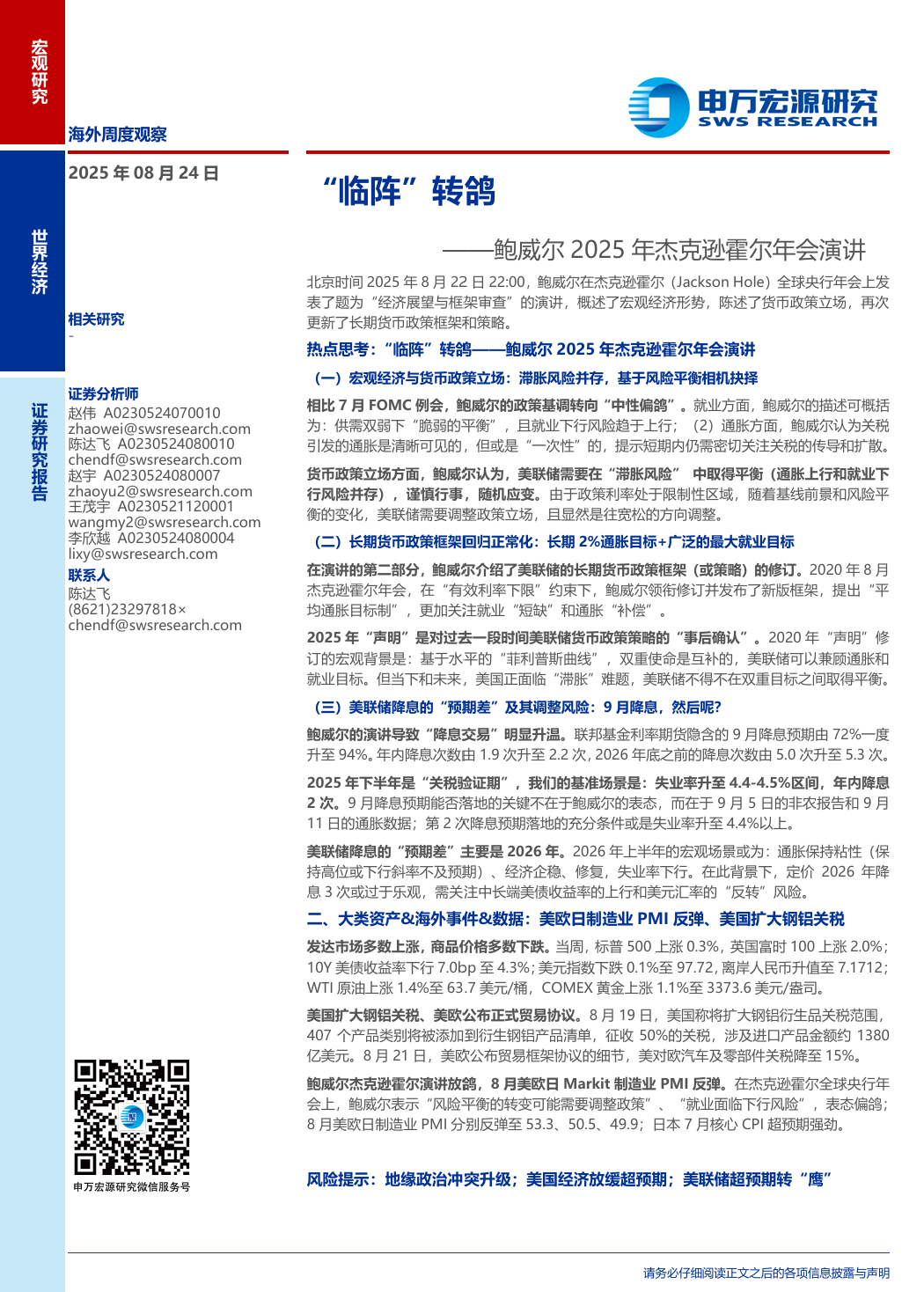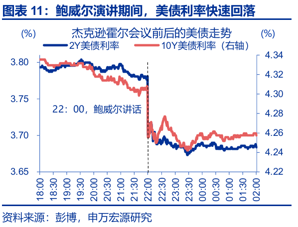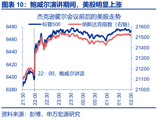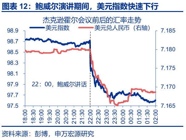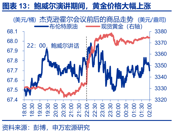 鲍威尔“中性偏鸽”的政策立场使9月降息预期明显升温。联邦利率期货隐含的9月降息预期由72%一度升至94%;年内降息总次数由1.9次升至2.2次,2026年底之前的降息次数由5.0次升至5.3次。伴随着降息预期的快速升温:1)美股大涨,标普500和纳斯达克指数分别上涨1.4%和2.0%;2)美债利率明显回落,10Y美债利率、2Y美债利率分别下行7.8bp、11.0bp至4.26%、3.68%;3)美元指数快速下行,跌1.1%至97.6;4)黄金大幅上行,由3330.3美元/盎司上涨1.3%至3374.6美元/盎司,原油价格震荡。