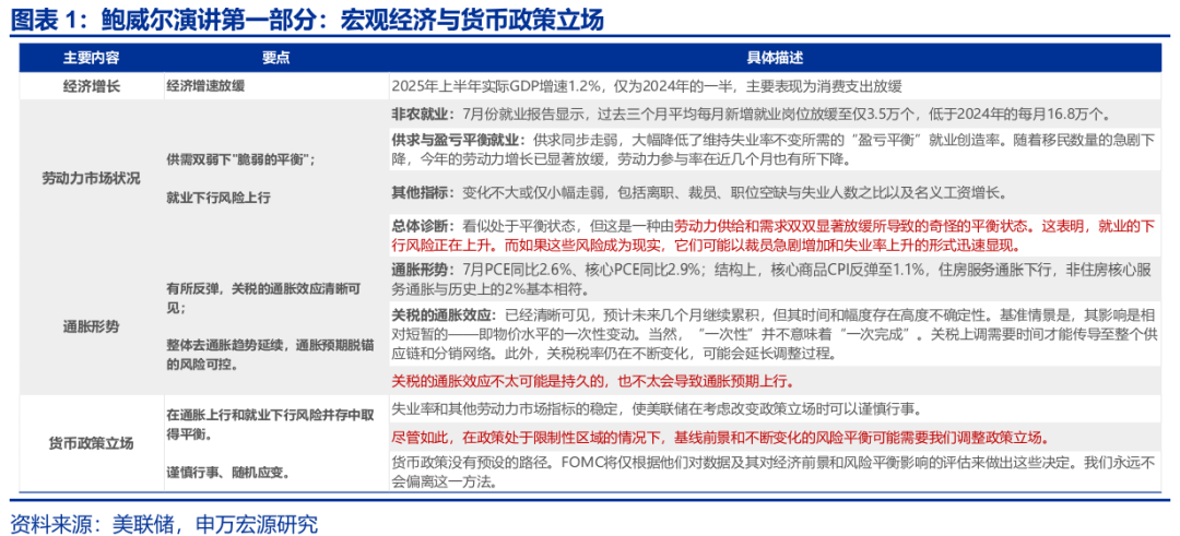 相比7月FOMC例会,鲍威尔的政策基调转向“中性偏鸽”。就业方面,鲍威尔的描述可概括为:供需双弱下“脆弱的平衡”,且就业下行风险趋于上行;(2)通胀方面,鲍威尔认为关税引发的通胀是清晰可见的,但或是“一次性”的,提示短期内仍需密切关注关税的传导和扩散。