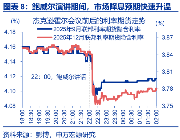 鲍威尔的演讲导致“降息交易”明显升温。联邦基金利率期货隐含的9月降息预期由72%一度升至94%。年内降息次数由1.9次升至2.2次,2026年底之前的降息次数由5.0次升至5.3次。