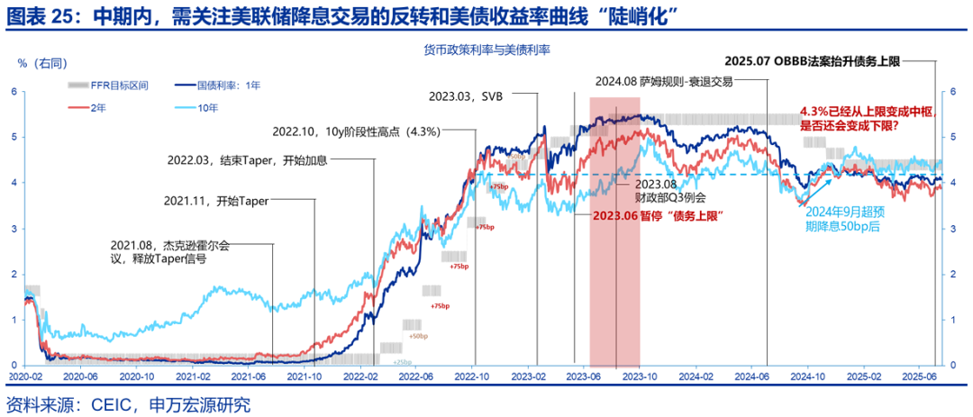 2025年下半年是“关税验证期”,我们的基准场景是:失业率升至4.4-4.5%区间,年内降息2次。9月降息预期能否落地的关键不在于鲍威尔的表态,而在于9月5日的非农报告和9月11日的通胀数据;第2次降息预期落地的充分条件或是失业率升至4.4%以上。