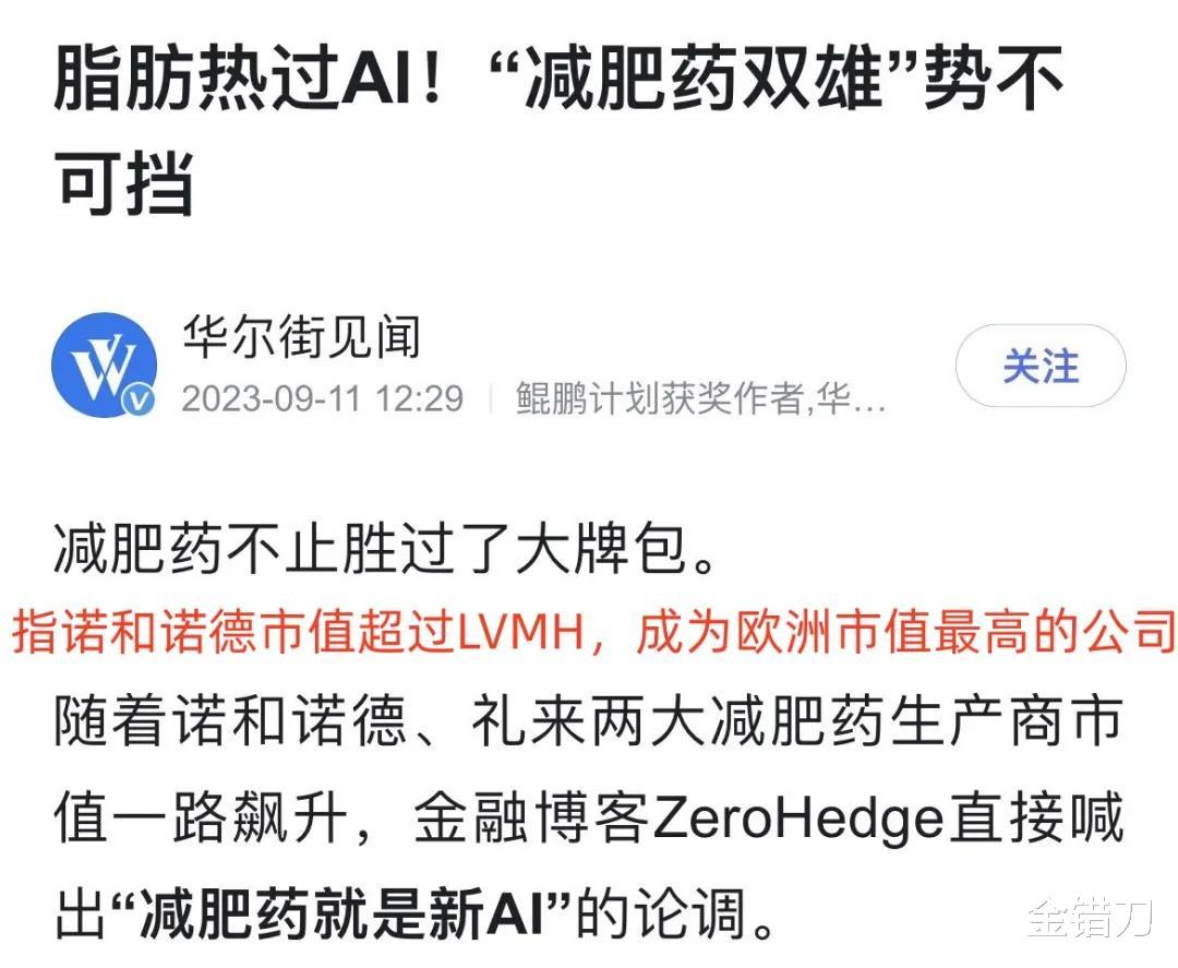 比如减肥药在资本市场上的热度比AI还高。丹麦药企诺和诺德,一年内股价翻倍,市值最高超4500亿美元,超过LV母公司,荣登欧洲公司市值第一的宝座。