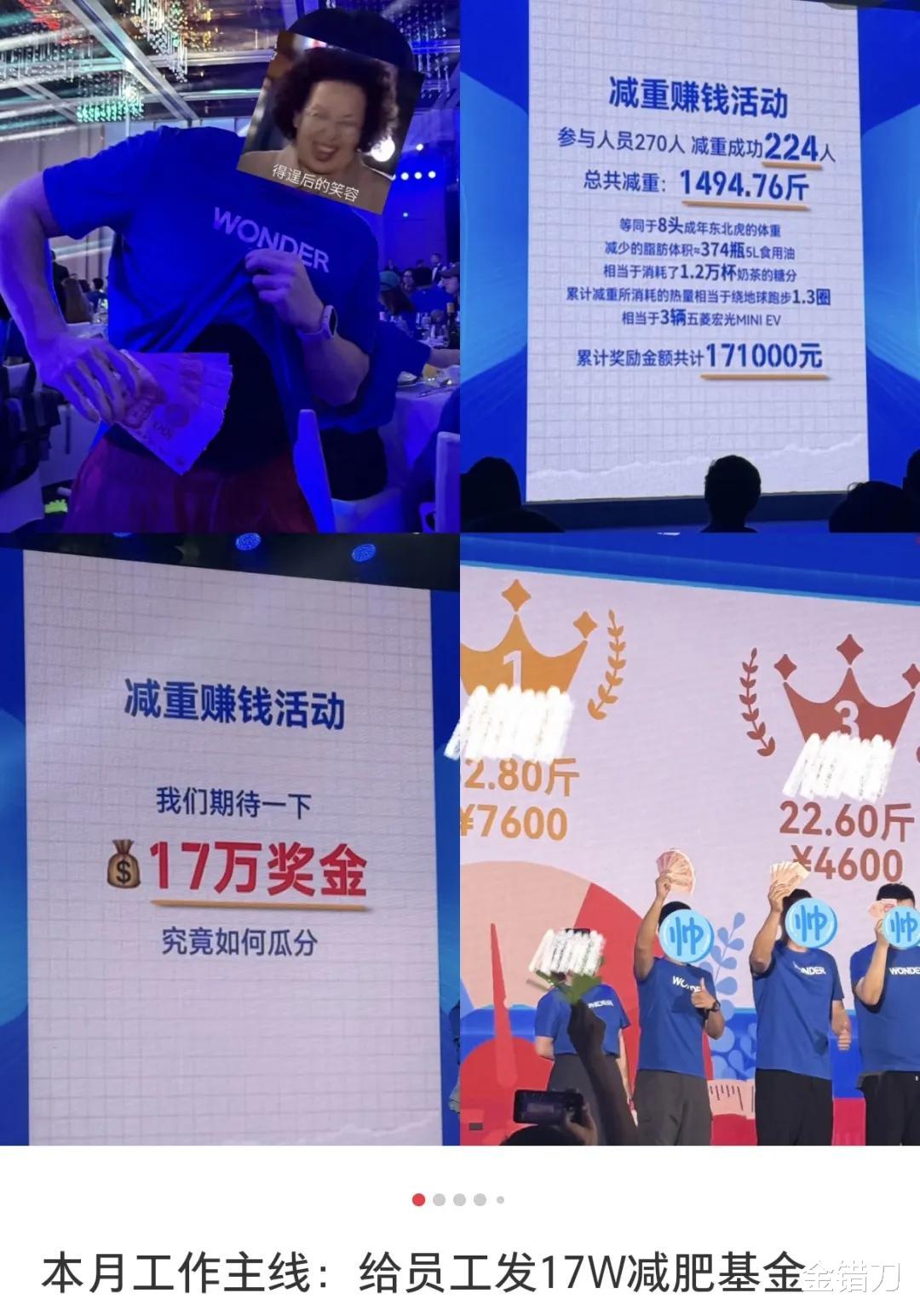 活动结束后,这家公司224名员工一共减了1500斤,公司发了17万的“减重金”。有个狠人一个月狂减30斤,直接入账7600元。